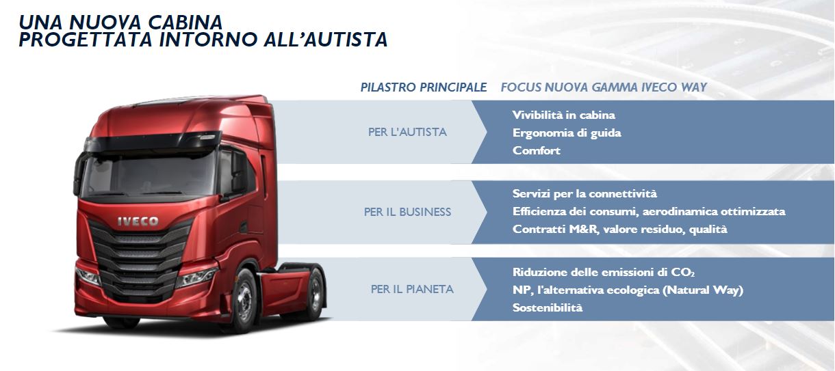 IVECO S-WAY NP è il leader indiscusso per il trasporto sostenibile su lunga distanza: questo camion connesso al 100% offre un'esperienza di guida superiore, efficienza senza compromessi in ogni mission, e il vantaggio competitivo di una soluzione di trasporto green e redditizia con il migliore TCO della categoria. La cabina è stata progettata in base alle esigenze del conducente, per migliorare le sue condizioni di guida, di lavoro e di vita ad un livello completamente nuovo. Con un funzionamento estremamente silenzioso, offre il miglior comfort acustico all'interno della cabina. L'ambiente spazioso e ben strutturato è ricco di caratteristiche di comfort e funzionalità avanzate. La nuova cabina è stata impostata per diventare la preferita dei conducenti.